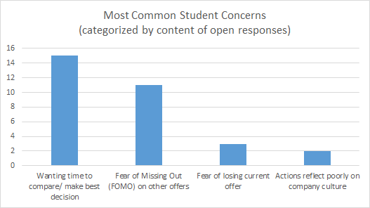 To give more detail on the more negative emotions, another revealing finding from this survey comes from an aggregation of open text-box responses from career service professionals exploring the student concerns around the perceived intensity of job-offer response timelines. Figure 5 shows that many students have FOMO (fear of missing out) on other potential opportunities, yet the majority of career services professional comments see that students are simply needing more time to reflect on the best decision.